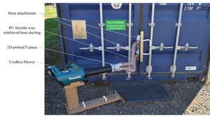 The second component of the system, to complement the extraction assembly, is the adaptation of a cordless blower (Figure 2). A DC 18 V brushless blower (model no. DUB184Z, Makita, Japan) with a maximum airflow of 13 m3/min, powered by a 5 Ah rechargeable battery, was used to promote airflow and positive pressure within the container. Two door attachments (each 220 mm long, 6 mm internal opening for airflow) were manufactured from stainless steel, designed to pass through the double rubber gasket to support the passage of forced air from the blower into the container, similar to a crevice tool. Attached to the blower outlet is a 3D-printed Y-piece which supplies air to both the door attachments via individually fitted 700 mm long polyurethane (PU) flexible wire reinforced hose ducting (51 mm internal diameter).