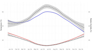 While temperature fluctuations in the 40 ft high-cube container followed a similar pattern (Figure 4), internal relative humidity deviated from the expected trend, showing no increase during the winter period as observed in the 20 ft container. Note that this container was approximately 80 per cent full with cardboard boxes from early 2024, whereas the 20 ft container remained mostly empty throughout this period.
